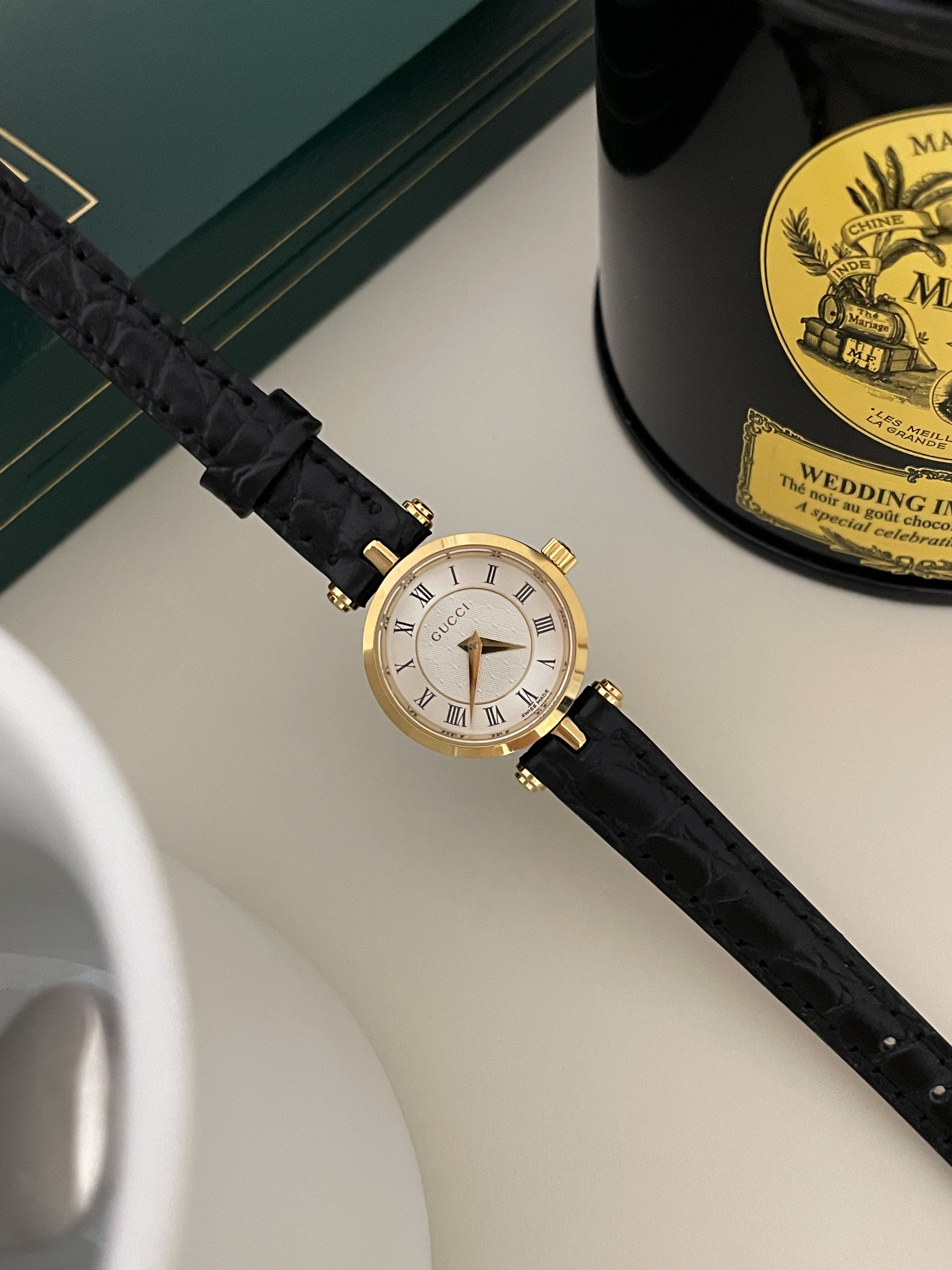 구찌 고유의 금장 색과 은은한 다이얼 무늬가 더욱 특별한 분위기를 연출합니다.