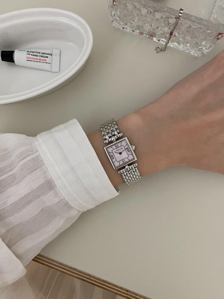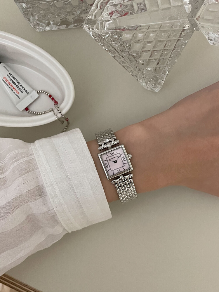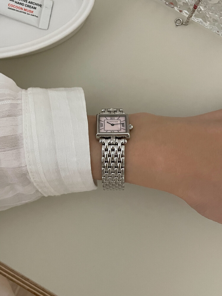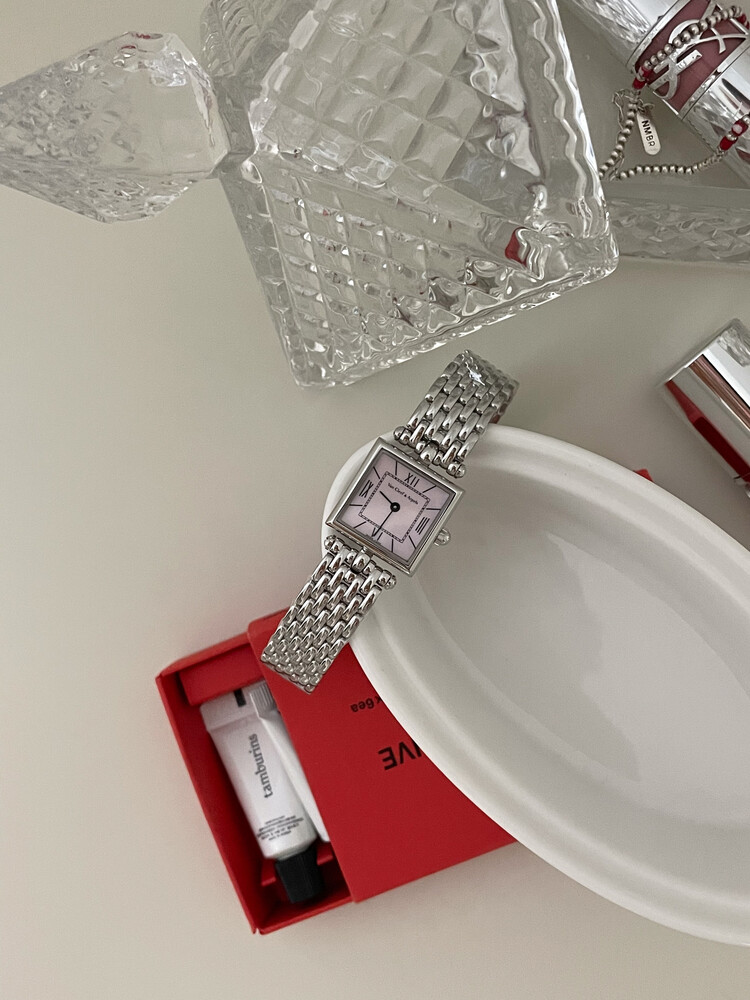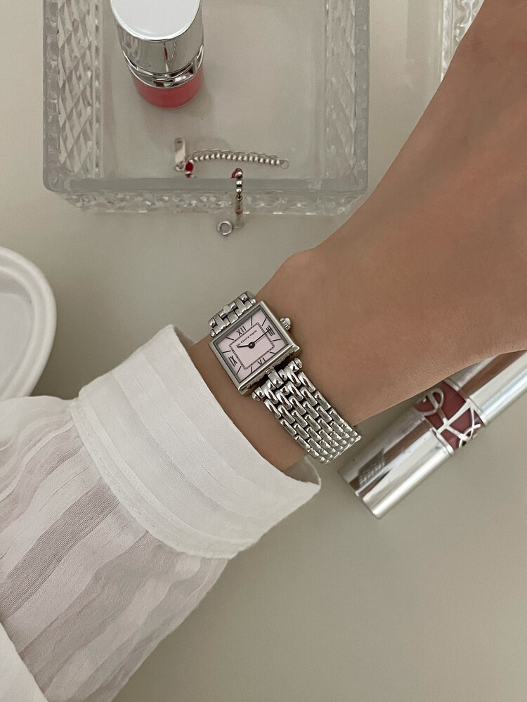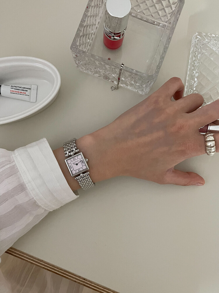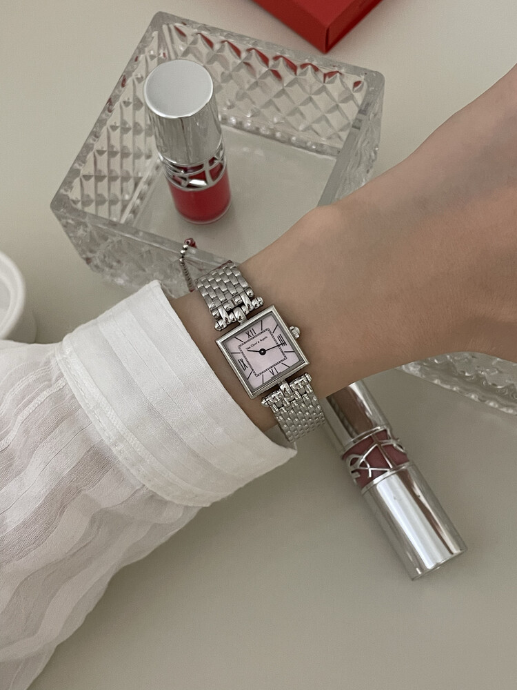 클래식한 스퀘어 베젤 속 우아하게 빛나는 핑크 자개 다이얼과