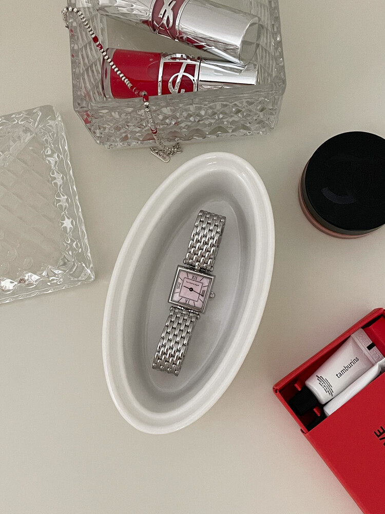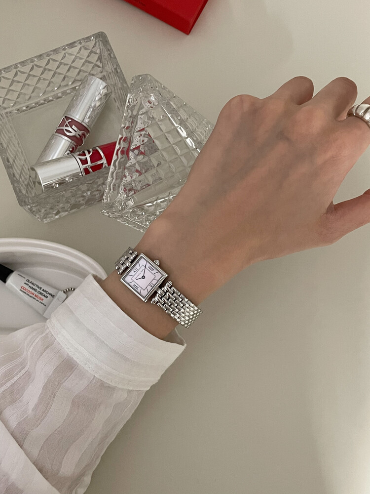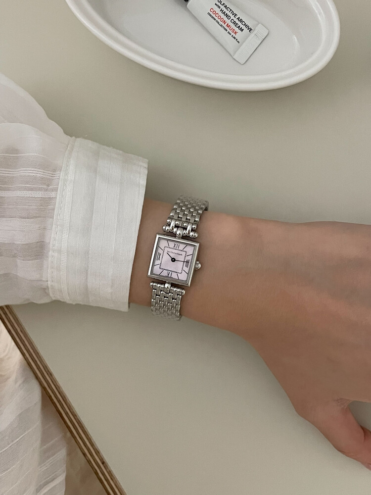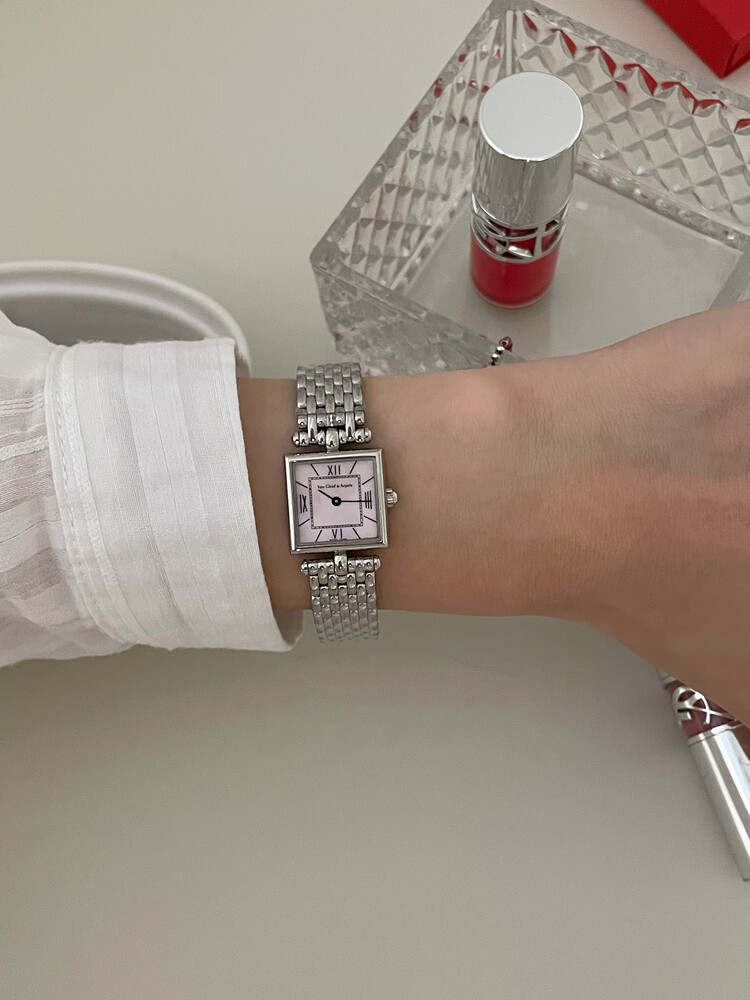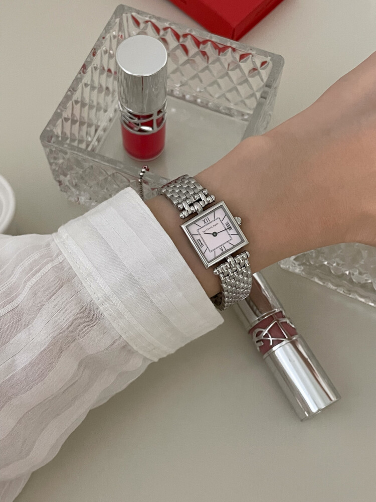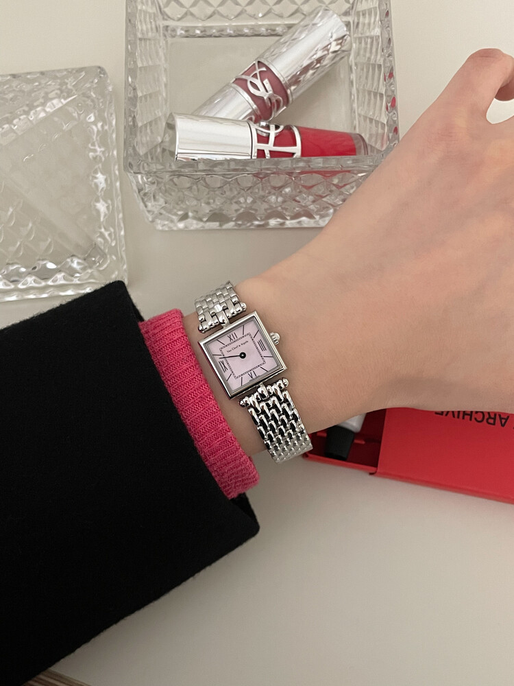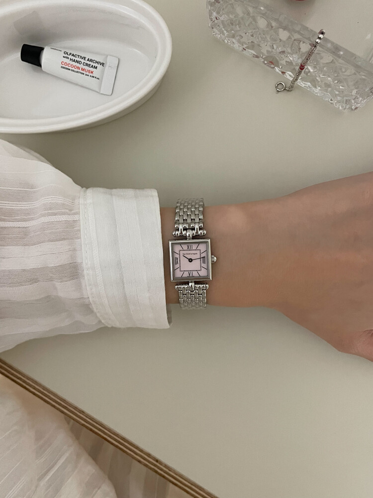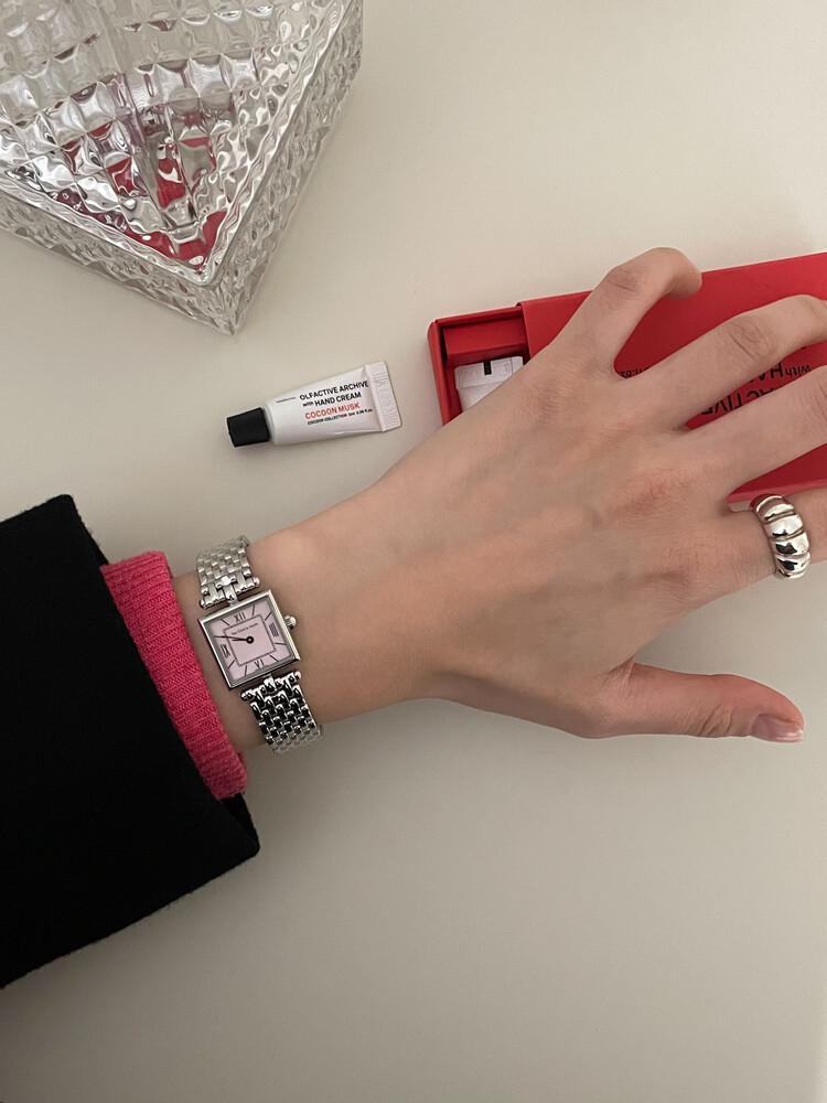 클래식한 스퀘어 베젤 속 우아하게 빛나는 핑크 자개 다이얼과