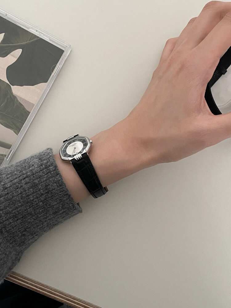 네이비 색상의 다이얼과 로마 인덱스가 옥타곤 디자인과 어우러져